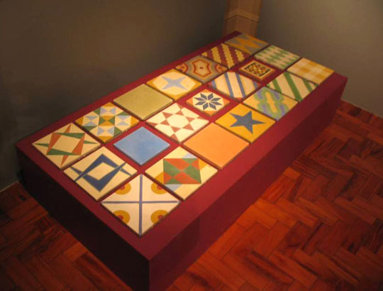 Brought by Italian immigrants to Brazil in the early 20th Century, a time of a major housing boom, the hydraulic tile had widespread use in the country, therefore it became part of the affective memory of Brazilians. The exhibition comprised about 500 tiles in various designs, some by artists such as Flavio de Carvalho, and further metal casts, tools, photographs and dyes that show a little of the homemade process. The pieces belong to the collection of researcher Antonio Alves de Carvalho, who has accumulated more than two thousand tiles. Exhibition design by Haron Cohen.